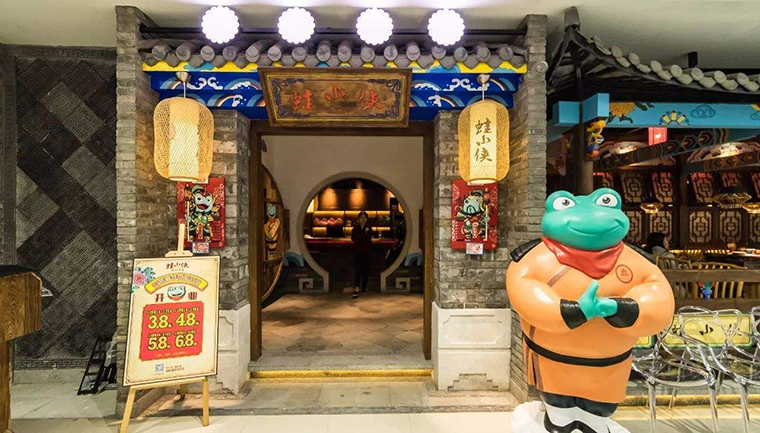 蛙小俠:以武俠IP形象切入餐飲,從品牌命名到圖形設(shè)計,再到空間裝飾,完全照搬功夫熊貓的武俠卡通形式,塑造了鮮明的武俠形象,品牌的識別度極高。品深餐飲設(shè)計認(rèn)為:模仿始終是模仿,并非自己獨(dú)有的品牌形象體系,始終給消費(fèi)者一種抄襲,模仿的感覺,不利于品牌未來的沉淀發(fā)展。