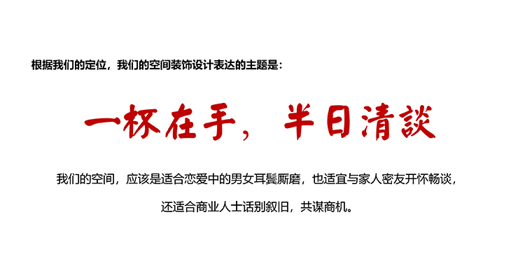 悅得閑廣式點心茶樓,整個品牌文化定位是純正廣式茶樓,得閑飲茶的廣式生活方式。所以,空間的整體應(yīng)該聚焦在“廣式地域文化、閑適生活文化、明廚亮灶”三大要素,通過地域文化表達地道純正,明廚亮灶傳遞現(xiàn)做特色,母胎文化嫁接超級IP推動品牌持續(xù)被傳頌,根據(jù)我們的定位,我們的空間裝飾設(shè)計表達的主題是“一杯在手,半日清談”,我們的空間,應(yīng)該是適合戀愛中的男女耳鬢廝磨,也適宜與家人密友開懷暢談,還適合商業(yè)人士話別敘舊,共謀商機。