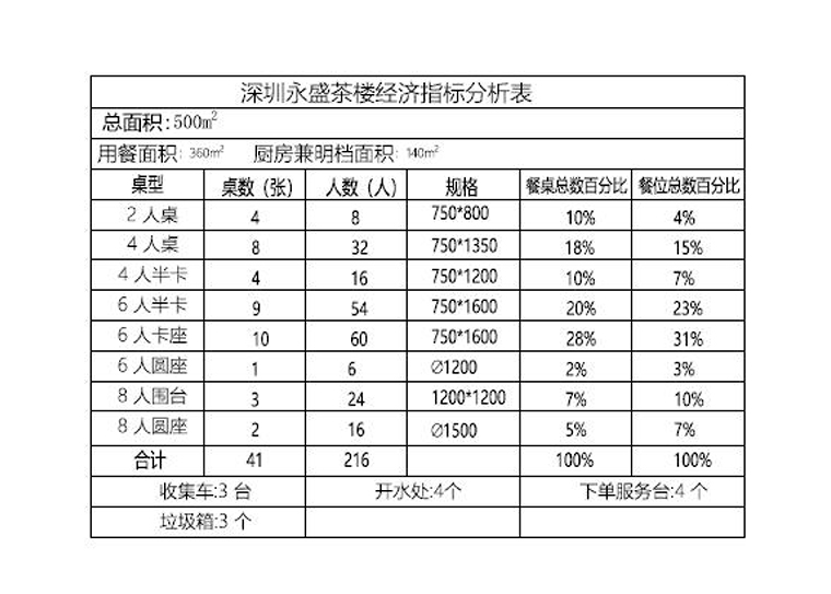 2、坪效計算:坪效重點就是考慮位置的利用率和位置的分布狀況。通過我們的研究發(fā)現(xiàn),深圳、廣州等地茶樓用餐座位利用率最高的多數(shù)是4人位和6人位。而在上海等地,最多應(yīng)該是4人位和2人位。我們不僅要關(guān)注位置的數(shù)量,更應(yīng)該綜合考慮位置的利用率。如果長期出現(xiàn)4個人的客人卻使用6人桌位,說明位置的實際實用率才70%而已,這是極度不合理的坪效。我們悅得閑的餐區(qū)位置6人位為主,4人位可以臨時拼接成8人位,甚至更多的位,滿足顧客的多樣化需求,提升餐區(qū)的位置利用率。