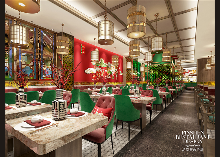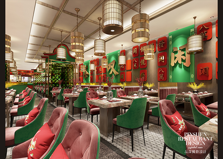 4、整體色調(diào):整個品牌以紅色、綠色、金色為主。其中紅色占比最高,一方面紅色最能溝起人們的食欲,紅色能給人以充滿活力的感覺,會刺激食欲。且紅色顯得熱鬧,具有傳統(tǒng)東方情節(jié)的老年人最為鐘愛大紅色的喜慶與吉祥。紅色太多會使空間過于悶和燥。所以我們局部使用了大面積的綠色,在安靜的同時,也能表達健康自然的養(yǎng)生概念。空間中通過紅色與綠色的撞色搭配,在傳遞茶樓屬性的同時,給人帶來美妙的色彩環(huán)境和舒適的氛圍,讓顧客樂在其中,且創(chuàng)造了鮮明的品牌調(diào)性。