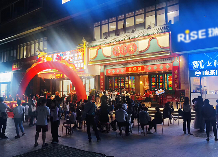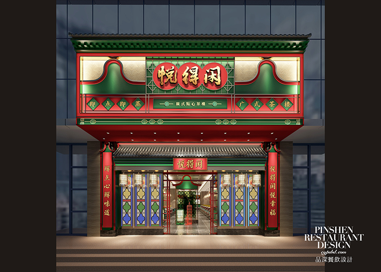 8、門頭形象:門頭是品牌的臉面,也是顧客接觸我們的第一個場景。門頭形象具有廣而告之的作用,門頭代表著餐廳的名字叫什么,賣的產(chǎn)品是什么,這是最基本且不可或缺的要素。門頭完全可以作為全方位展示店特色的工具,巧妙的組合可用信息向客戶發(fā)送品牌信息,從而引發(fā)客戶興趣。悅得閑廣式點心茶樓的門頭大量使用鑊耳山墻,讓廣式茶樓的特性展露無遺。