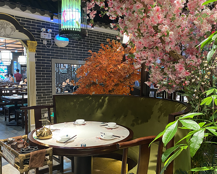 5、花藝綠植。綠化是室內設計中經常采用的裝飾手段,幾乎所有的餐飲空間都有綠化的裝扮。綠化在餐飲空間中的運用非常廣泛,不同的餐廳,花藝綠植的應用差別很大。一般的餐廳面積有限,綠植和花藝使用較少。主題類中餐廳,花園餐廳喜歡使用大量的花藝綠植,為了方便打理,花藝綠植都選用塑料花。品深設計策劃設計的蘩樓全天茶市,二小姐的店,都使用了不少花藝。其中二小姐的店選用的就是粉紅桃花,營造出了小橋流水,江南小鎮的感覺。