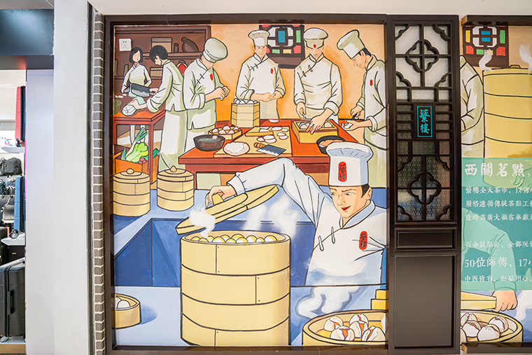 為了傳達蘩樓鮮做點心的核心優勢,我們在品牌宣傳上不斷用口號“西關茗點,蘩樓鮮做”強化訴求。同時創作了蘩樓點心師傅現場進行點心鮮做的場景,從原材料到制作然后現蒸一一展示,把一個要用200字描述的場景,轉換成一張圖畫來表達,真實具象地還原了“蘩樓鮮做”場景,讓顧客一下就記住了蘩樓鮮做的核心優勢。品深餐飲設計將此畫面應用到餐廳空間設計中,使之成為非常有效的傳播媒介。