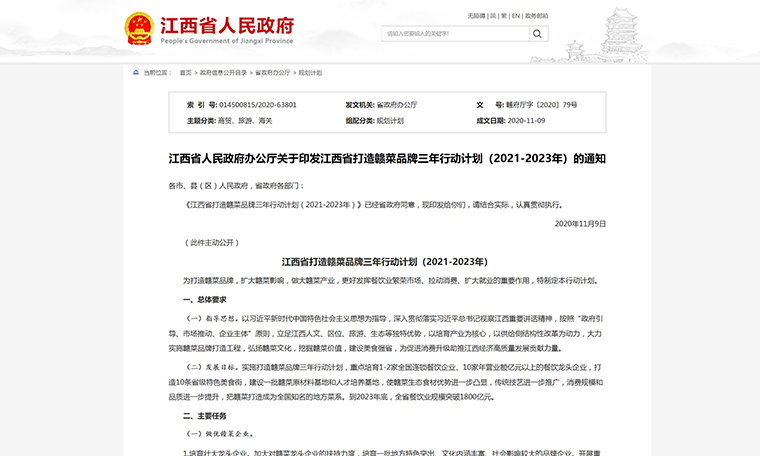 贛菜美味眾多,然而,相比湘菜、粵菜等全國八大菜系,贛菜還是缺乏全國影響力。為打響贛菜品牌,近年來,江西省政府采取了系列措施,包括評選最喜愛的贛菜,舉辦中國贛菜美食文化節,推動贛菜進京等等。近日,江西省政府又出臺了《江西省打造贛菜品牌三年行動計劃(2021~2023年)》(以下簡稱《行動計劃》)共提出包括做優贛菜企業、提升贛菜品牌等主要任務。
