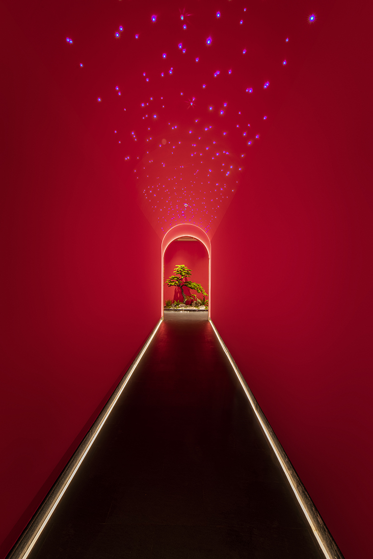 部分立面使用玻璃磚作為隔斷,在燈帶烘托下,產生一種晶瑩剔透感,時尚又夢幻;大廳卡座的隔斷高110CM,圓洞虛實結合,畫在景后,景在畫中。