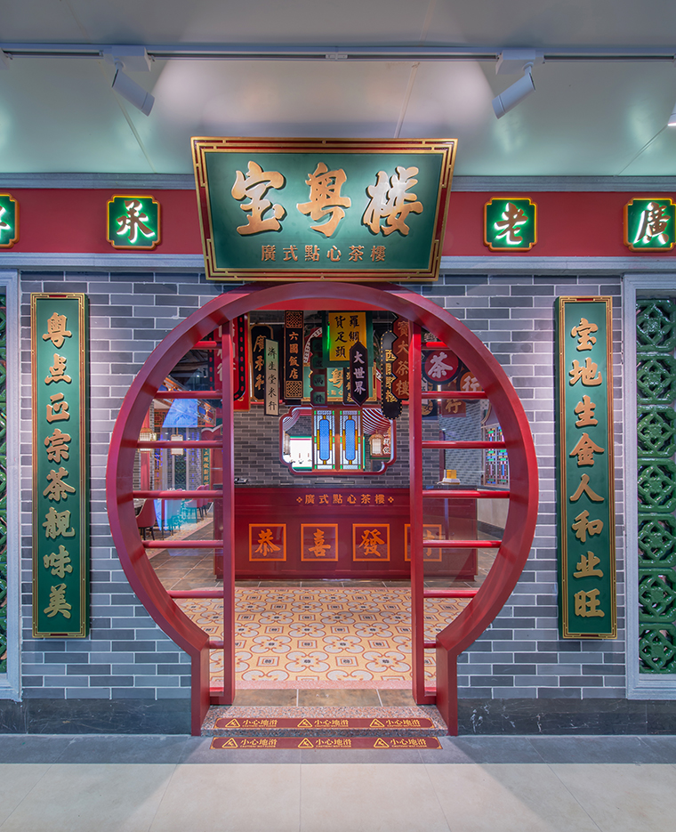 ;收銀臺上方吊著的各種就是店招,店旗,很好的傳達了品牌的悠久歷史;墻面的各種原創(chuàng)畫面,金屬發(fā)光字、各種匾額對聯、天花上的剪紙圖形,各種元素多而經典,雜而不亂。品深餐飲全案設計團隊從不同的角度,用不同的元素,以非常有序且充滿了趣味的方式傳達出寶粵樓品牌的老廣州西關文化特性。