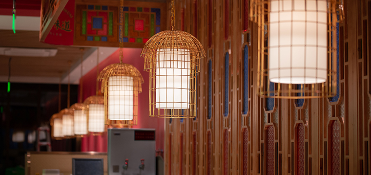 此次寶粵樓的空間軟裝陳列設計,涵蓋了餐桌餐椅、收銀臺、服務臺、收納柜、沙發(fā)坐具等餐飲家具;空間吊燈及照明裝飾設計;裝飾品、雕塑擺件、工藝品、畫藝軟裝以及最重要的品牌定制裝置軟裝。家具的主色調與品牌的主色調保持一致,椅子的款型也選用了廣州西關老式茶樓中的椅子;我們所使用的吊燈模仿鳥籠造型就是為了傳遞廣州老茶客提籠遛鳥飲早茶的悠閑幸福生活,和整個品牌文化高度契合;