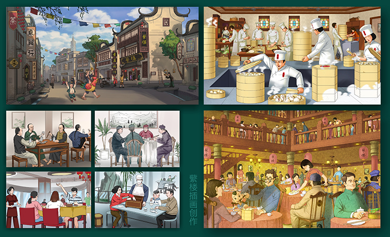 4、根據蘩樓的歷史淵源,還原當年的茶樓畫面: