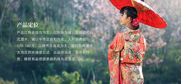 人均消費在120-180元,以晚市及宵夜為主。定位為粵港澳大灣區(qū)的環(huán)境很日式、出品很地道、服務(wù)有特色,精致有品但很親民的燒鳥居酒屋。