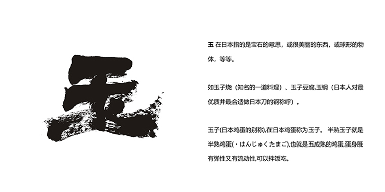 “玉”在日本指的是寶石的意思,或很美麗的東西,或球形的物體等等。如玉子(日本雞蛋的別稱),半熟玉子就是半熟雞蛋(はんじゅくたまご),也就是五成熟的雞蛋,蛋身既有彈性又有流動性,可以拌飯吃。玉子燒(知名的一道料理),玉子豆腐,玉鋼(日本人對最優(yōu)質(zhì)并最合適做日本刀的鋼的美稱)。