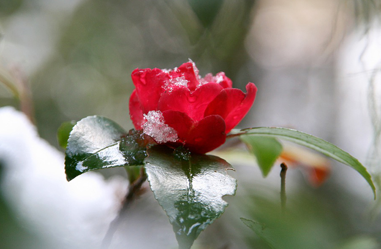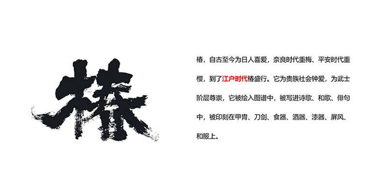 “椿花”是日本對山茶花的稱呼,花期一般是在冬至春季。椿花的花色秀麗脫俗,香氣清新怡人,人聞到后有精神爽朗的感覺。在日本,椿花與櫻花齊名,被譽為“圣花”。奈良時代重梅、平安時代重櫻,到了江戶時代椿盛行。“椿”為貴族社會鐘愛,為武士階層尊崇,它被繪入圖譜中,被寫進詩歌、和歌、俳句中,被印刻在甲胄、刀劍、食器、酒器、漆器、屏風(fēng)、和服上。