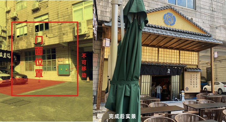 玉椿燒鳥居酒屋首店位于深圳的餐飲網(wǎng)紅高地——車公廟十畝地正對面。門店之前是一家中餐的后廚的全部空間及部分包間,其中一半的面積屬于上一家餐廳自己搭建的二層。空間結(jié)構(gòu)非常復(fù)雜,地面高地不平,尤其是搭建部分的1層,2層實際高度不到2.5米,心理感受很逼窄,這個場地極為