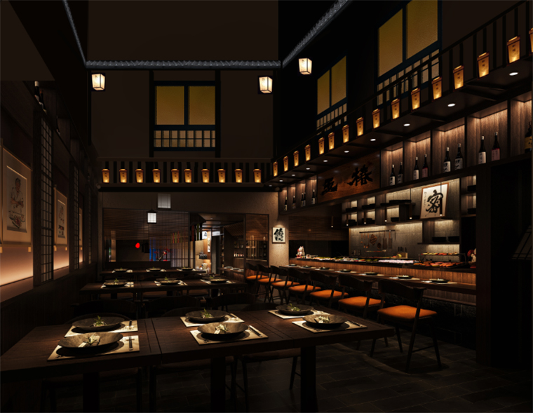 2、一樓大廳及吊頂?shù)脑O(shè)計:把京都的古老街道,巷子搬到我們店里。整個大廳的頂部環(huán)繞一圈日式黑瓦頂,四周幾個日式玻璃木窗,與地面的青石瓦面,墻體的稻草漆,燒烤吧臺形成一體化的京都風(fēng)格。置身其中,仿佛