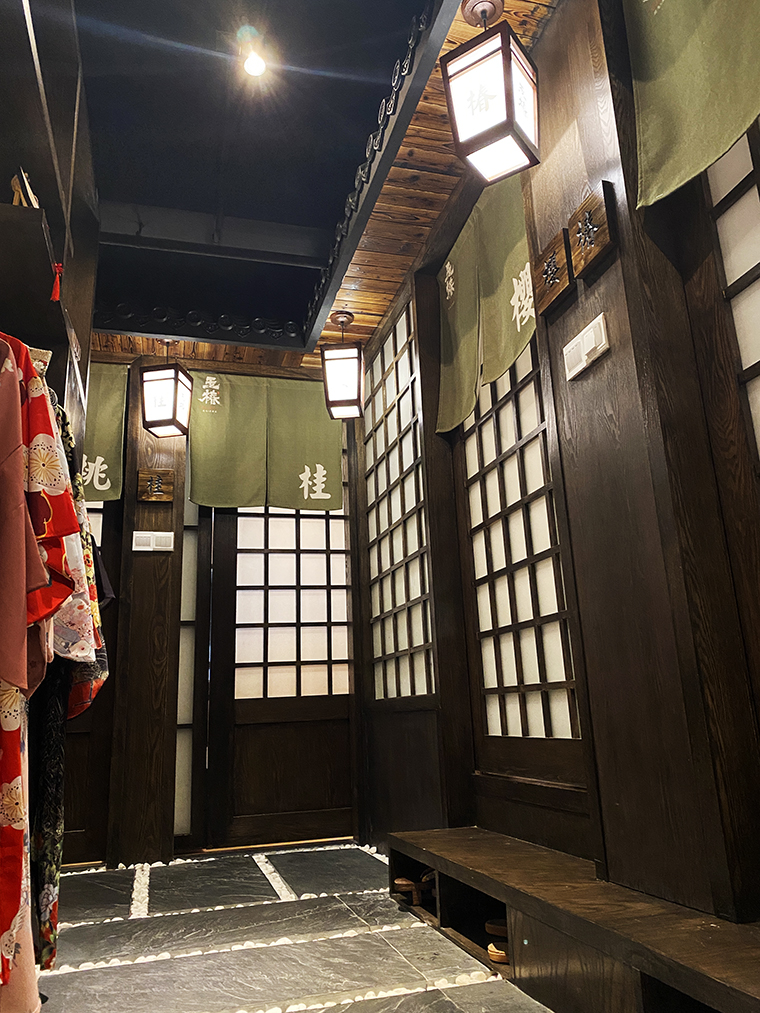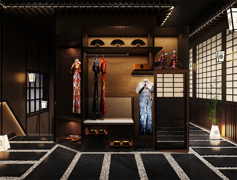 二樓除了必備的洗手間、儲物柜外,還設(shè)置了和服展示區(qū),這是餐飲娛樂化的一大重要趨勢。