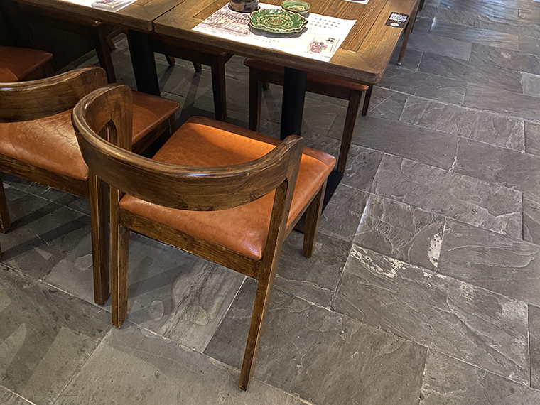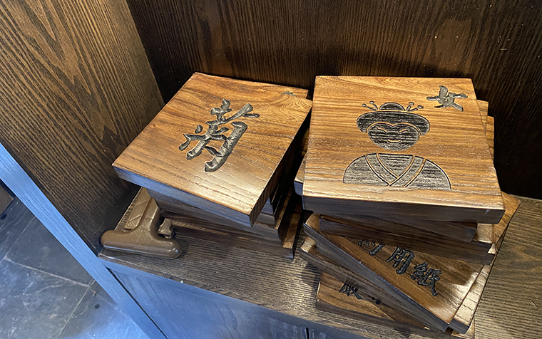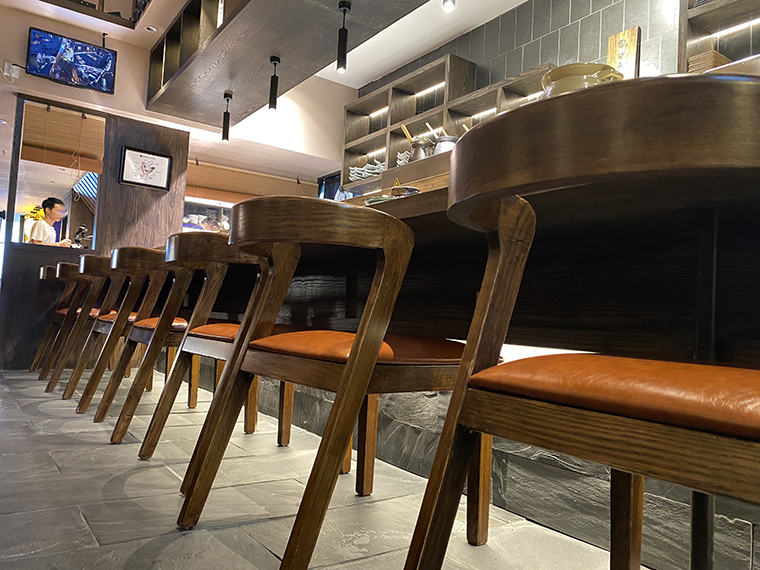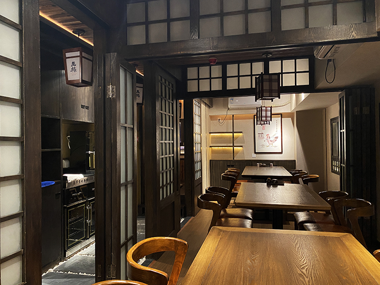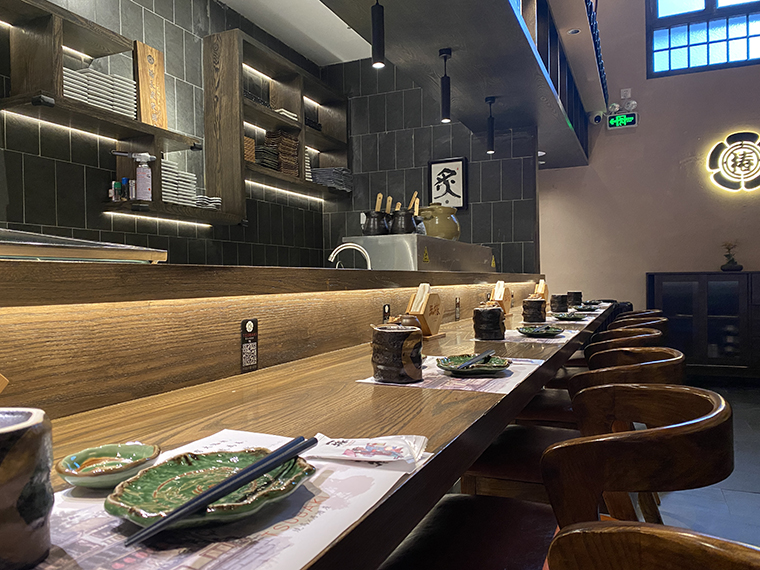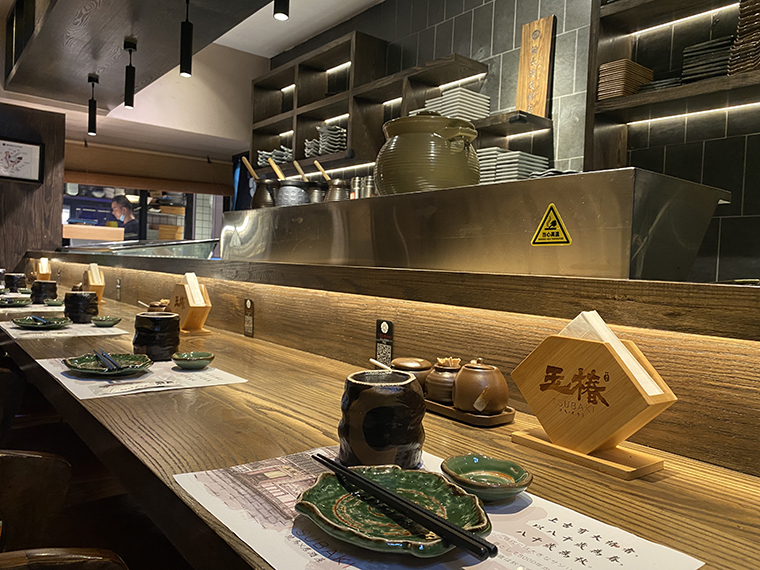 為了營造京都風(fēng)格的空間感受,品深餐飲為玉椿設(shè)計定制的家具采用了實木材質(zhì),開放漆做舊工藝處理,呈現(xiàn)出一種江戶時代的歷史滄桑質(zhì)感;與門店的招牌匾額,儲存柜顏色完全一致,顧客使用時候的歷史