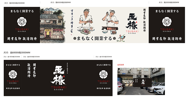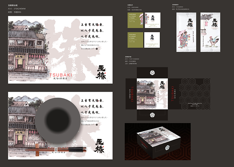 我們希望透過這個書法文字的LOGO標識及輔助的家徽圖案塑造玉椿經(jīng)典的日式美學(xué)氣質(zhì)和料理文化底蘊。表達品牌傳承百年,初心如一的愿景,使之成為指引玉椿品牌前進的燈塔。玉椿燒鳥居酒屋,將“