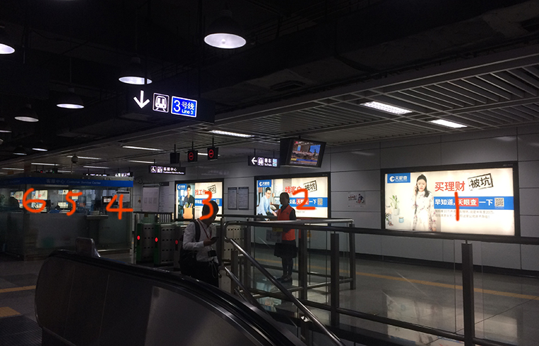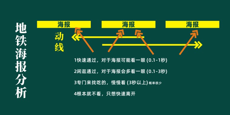 通過在地鐵站現(xiàn)場觀察,品深發(fā)現(xiàn)蘩樓的地鐵海報位置單面靠墻,閱讀動線是沿著墻的路徑左右行走,目標是向前方換乘或出站,由于客流密集,路過此處的人完全無法停下來,看到海報的大部分的機會是眼睛的余光一掃而過,邊走邊看。