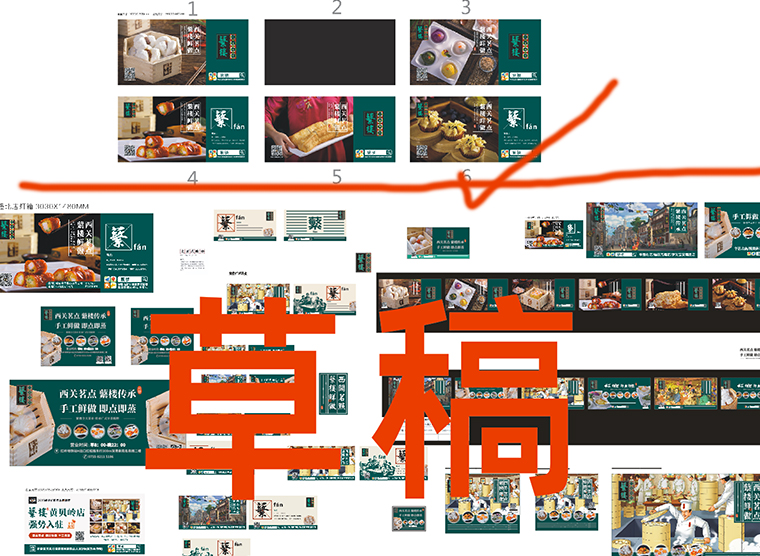 此次海報設計有六個連續(xù)畫面,正好適合推廣明星款產品。因蘩樓的產品本身就有較強的藝術美感及傳頌效果,綜合店長及蘩樓主廚師建議,我們選取了6款產品來作為本次海報主題畫面,每一款海報主推一款明星產品,以連續(xù)陣列式畫面排開,顧客路過通過6個重復品牌畫面+強調明星產品的形式,視覺震撼,很容易形成對蘩樓的品牌記憶。