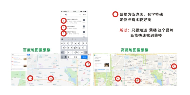 蘩樓”這個詞在搜索端屬于新詞,且由于都是臨街店鋪,只要在導航地圖上搜索“蘩樓”即可出現(xiàn)店面的準確地址,因此在海報地址信息中只需要告訴顧客店址區(qū)域即可,如:“華強北店”顧客自動腦補深圳華強北區(qū)域蘩樓,加上智能手機強大的導航功能,只需要搜索“蘩樓”選取“華強北”為主的關鍵詞即可知道離店的大概距離。