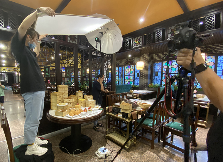 為達到理想拍攝效果,品深設計師再次來到蘩樓與廚師交流,了解這十款產品的特色,用料,制作工藝等細節(jié),同時也購買有關廣式點心制作相關書籍進行對比學習,獲得很多新發(fā)現(xiàn),如:判斷手工炸油條好壞,必須要展示其“