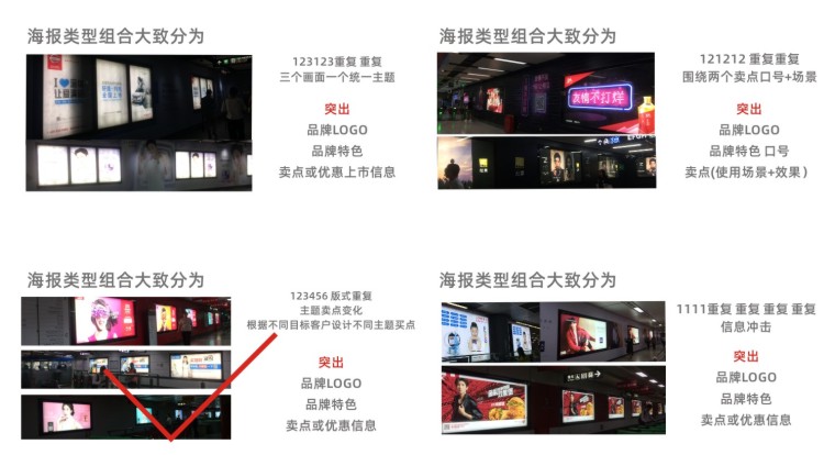 我們選取了(周末時間+上班時間)兩天,對深圳客流密集的多個地鐵中轉站點,和幾個特定時間段。進行現(xiàn)場蹲點觀察,并拍攝了目前1000多張地鐵站現(xiàn)存的海報圖片實例。通過對海報圖片的分類整理,地鐵站客流對廣告關注度點的觀察。最終團隊投票選取出印象最深且能傳達品牌信息的多張地鐵站品牌海報進行廣告?zhèn)鞑ピ砑霸O計原理逆向推理分析: