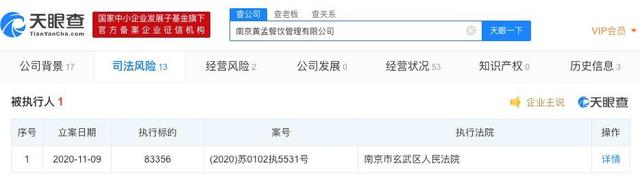 天眼查App顯示,近日,南京黃孟餐飲管理有限公司新增一條被執(zhí)行人信息,執(zhí)行法院為南京市玄武區(qū)人民法院,案號為(2020)蘇0102執(zhí)5531號,執(zhí)行標(biāo)的83356。據(jù)新京報(bào)報(bào)道,黃磊和孟非共同經(jīng)營的火鍋店“黃粱一孟”所屬公司即為南京黃孟餐飲管理有限公司。目前,該店已經(jīng)閉店。此外,今年9月,南京黃孟餐飲管理有限公司發(fā)生工商變更,黃磊退出投資人。